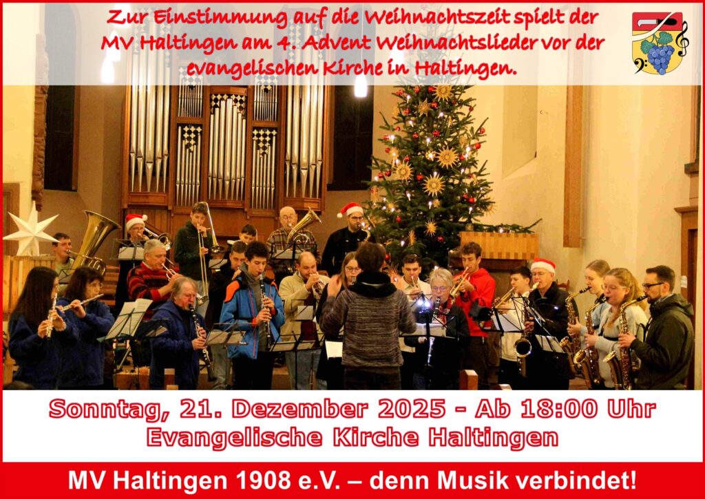 Am 4. Adventssonntag, den 21. Dezember 2025 spielt der Musikverein Haltingen 1908e.V. ab 18.00 Uhr Weihnachtslieder vor der evangelischen Kirche in Haltingen.