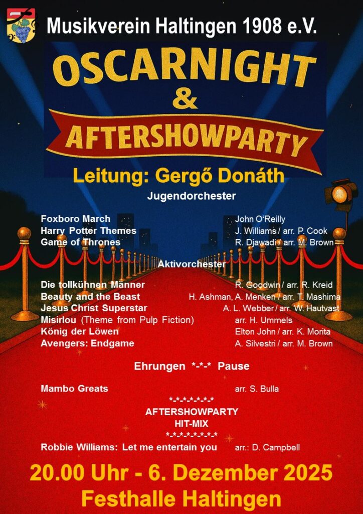 In diesem Jahr hat unser Dirigent Gergő Donáth ein Programm zusammengestellt, das ganz im Zeichen einer rauschenden Oscarnacht steht! Erleben Sie mit uns einen glamourösen Abend voller musikalischer Highlights aus der Welt der Film- und Pop-musik. Von bewegenden Soundtracks bis zu mitreißenden Hits – unser Programm ist eine Hommage an die Magie des Kinos und die Kraft der Musik. Nach dem Konzert laden wir Sie herzlich zur Aftershowparty ein, bei der wir gemeinsam feiern, anstoßen und den Abend in bester Gesellschaft ausklingen lassen.