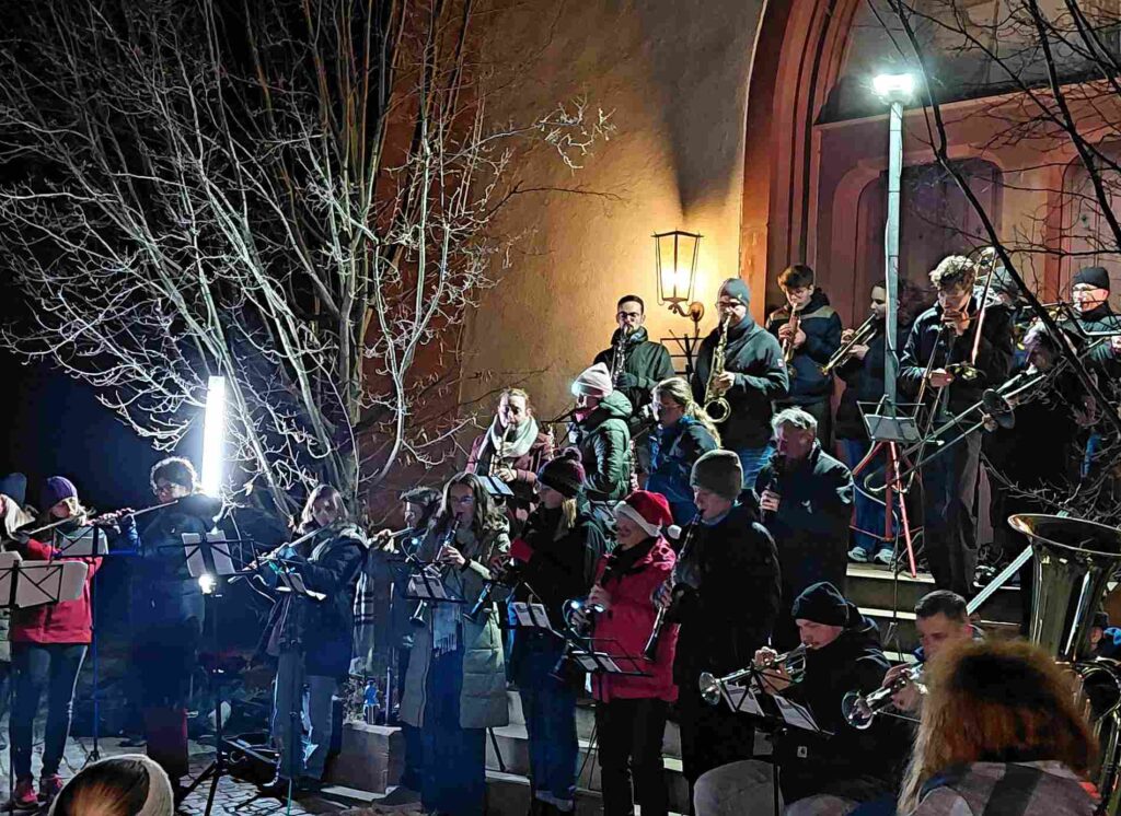 Zur Einstimmung auf die Festtage haben Jung- und Aktivmusiker sowie einige Ehemalige des Musikvereins Haltingen am vierten Adventssonntag vor der Haltinger Sankt-Georgskirche Weihnachtslieder gespielt. Die zahlreichen Zuhörer konnten sich an den Weisen erfreuen und Dank der ausgeteilten Liedblätter nach Lust und Laune auch kräftig mitsingen. Mit heißem Glühwein und Kinderpunsch war auch für das leibliche Wohl der Zuhörer und Teilnehmer gesorgt. Nach einer Dreiviertelstunde gemeinsamen Singens und Musizieren wünschte der Vorsitzende Jürgen Wehrle frohe Weihnachten und einen guten Rutsch ins Neue Jahr.