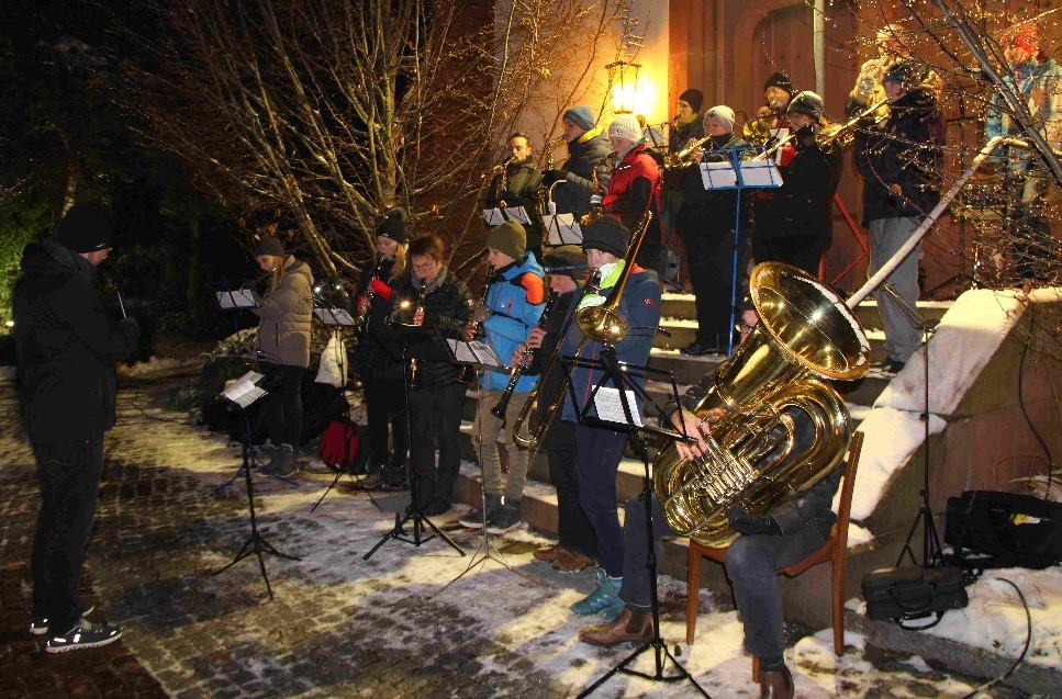 Schon seit mehr als zehn Jahren spielt der Musikverein Haltingen am Wochenende vor den Festtagen Weihnachtslieder auf dem Platz vor der evangelischen Kirche in Haltingen. Vor dem Beginn wurde ein Büchlein mit den Texten verteilt. Ein heimeliges Feuer war angezündet worden, an dem sich die Sänger aufwärmen konnten, heißt es im Nachgang. Für das innere Aufwärmen gab es Glühwein und Apfelpunsch. Die Gruppe der Musiker des Musikvereins setzte sich aus dem Aktiv- und dem Jugendorchester zusammen. Unter Leitung des Dirigenten Adam Jakab erklangen bekannte Weihnachtslieder wie „O Tannenbaum“, „O du fröhliche“ und „Stille Nacht, Heilige Nacht“, die von den Anwesenden gerne mitgesungen wurden. Nach einer guten Dreiviertelstunde gemeinsamen Singens und Musizierens verabschiedete Vorsitzender Jürgen Wehrle die Besucher, wünschte allen frohe Weihnachten und einen guten Rutsch ins neue Jahr